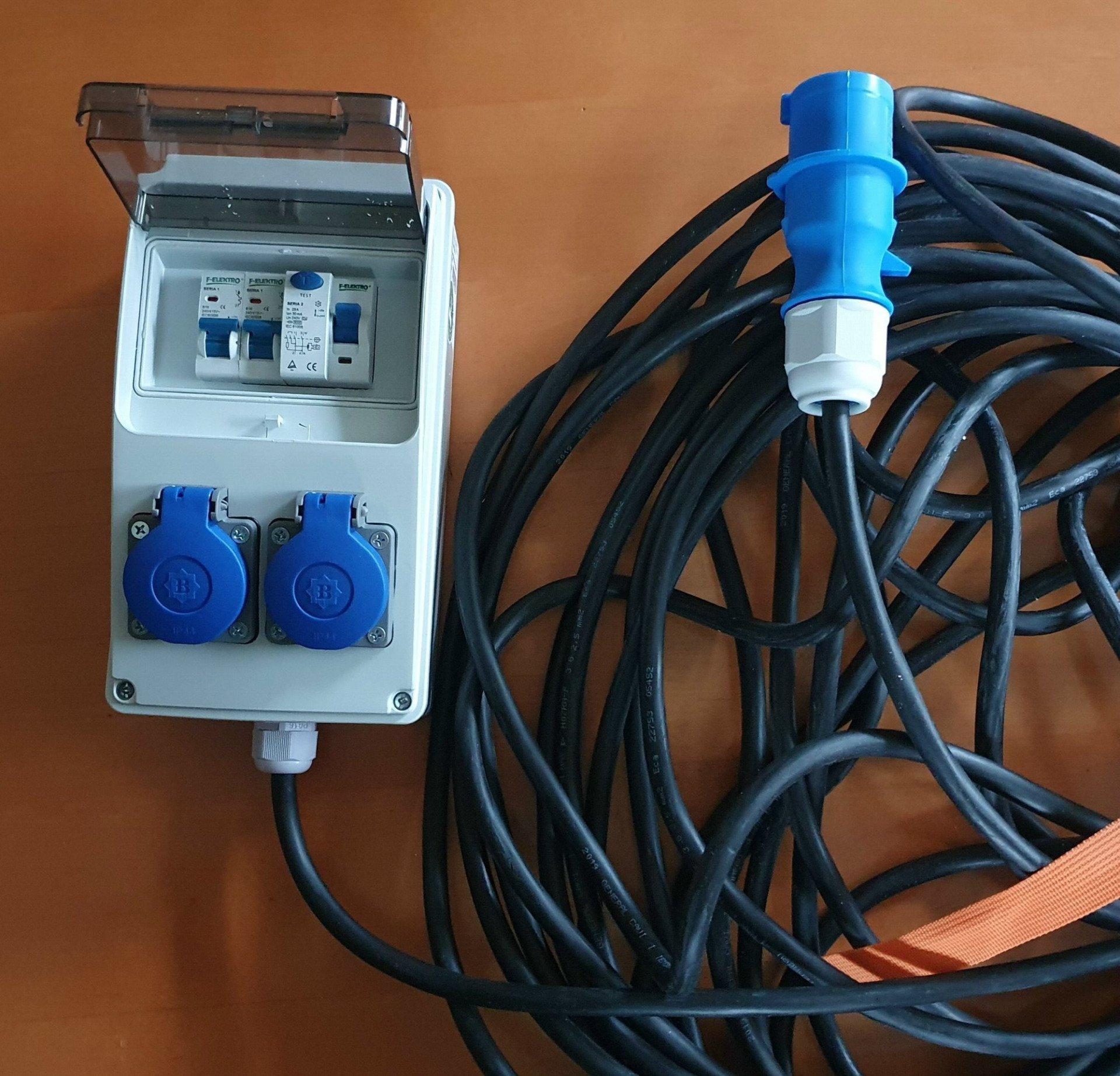 Mit meinem KIT-Stromversorgung habe ich mit einem Baustromverteiler den geforderten RCD und LS mit 16A sowie 2 Schukosteckdosen. Die Versorgung darf nur über Gummischlauchleitung H07RN-F mit 2,5 mm2 erfolgen. Diese ist 25m lang. Und fest angeschlossen ist ein normgerechter CEE Stecker.